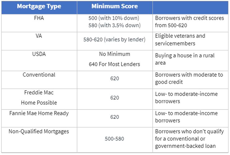 - FHA – stands for the Federal Housing Administration. These loans are popular for a few reasons. For one, they contain the lowest credit score requirements of any major home loan program. If you have a credit score of 580 or higher, you can get a loan by only putting 3.5% down. You can borrow with credit scores as low as 500, but you will just have to put 10% down.